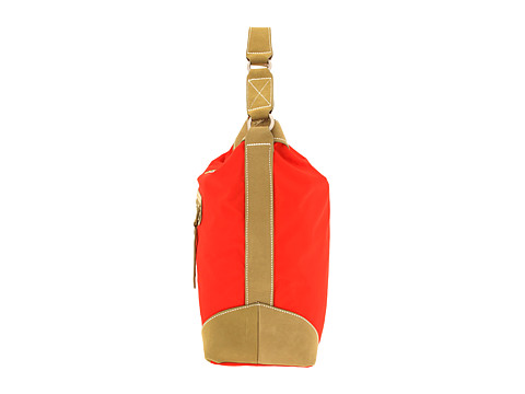 Fashionable shoulder bag made of 100% nylon with nubuck leather trim.