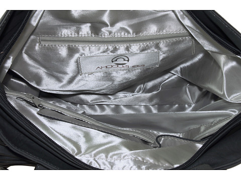 Shiny interior lining with a back wall zip pocket and front wall multifunctional slip pockets.